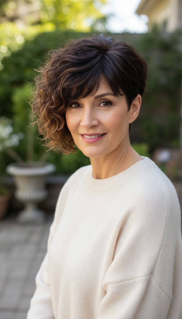 The asymmetrical pixie is a bold, artistic option among curly hairstyles for women over 60. This style features one side cut very short, similar to a traditional pixie cut, while the other side is left longer, resembling a short bob. This contrast creates a dynamic, modern look that defies age. It is a short length cut that offers the drama of a long style without the maintenance. The layered longer side allows your curls to spiral, while the short side keeps it neat. This is a great wash and wear style because the asymmetry is the styling point itself. It adds visual interest to thin hair and works beautifully with dark brown or multi-tonal hair colors. It is far more adventurous than a standard shoulder-length cut or mid-length cut. You can blend the longer side into side bangs. This curly hairstyle is perfect for the woman who wants to make a statement and step away from the traditional shoulder-length norms.