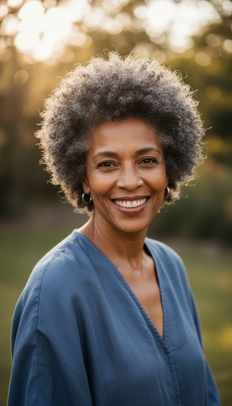 Embracing natural texture is beautiful, and the cropped afro is one of the most empowering curly hairstyles for women over 60. This style keeps the hair at a uniform short length, creating a halo effect around the head. It is essentially a longer, textured pixie cut that celebrates volume. Unlike a long style or a weighted shoulder-length cut, this crop defies gravity. It is the ultimate wash and wear style for Type 4 hair, requiring mostly hydration and minimal manipulation. It is distinct from a bob or a layered mid-length cut because of its rounded silhouette. This curly hairstyle is excellent for thin hair as the natural coil creates immense density. It looks regal in natural grey or dark brown. With no need for bangs or parting, it frames the face openly. It frees you from the detangling time of a shoulder-length style while offering a soft, feminine alternative to an ultra-short pixie.
